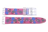 This watch band is not manufactured by Swatch but it is designed to fit Swatch watches. This pink with swirl design plastic Swatch Replacement watch band sports water resistance and is meant to fit on large 17mm Swatch watches. Pink with Swirl Design Swatch Style Watch Band Fits Standard Mens / Unisex Swatch Watches 17mm (Notched) Semi-Clear Plastic Buckle